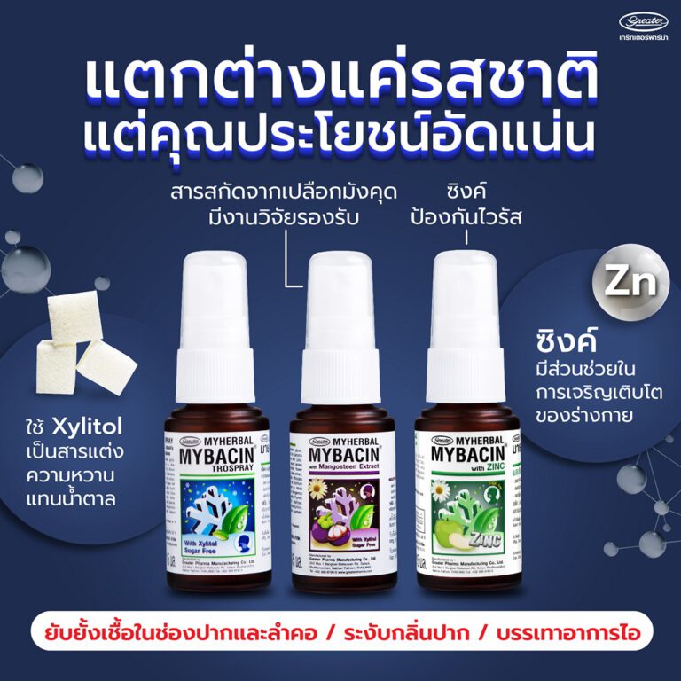 เหตุผลหลักทำไมต้องใช้ Mybacin Mouth Spray สเปรย์ดับกลิ่นปาก ใช้ดับกลิ่นปากและยับยั้งเชื้อแบคทีเรีย สำหรับช่องปากและลำคอ มีส่วนผสมของสารสกัดจากธรรมชาติ สรรพคุณที่ผู้เชี่ยวชาญก็ยอมรับว่าดีมีประโยชน์ตอบโจทย์ชีวิตวิถี New Normal แบบสุดๆ โดยเหตุผลที่จะช่วยตอบคำถามได้ว่า…ทำไมต้องเลือก “มายบาซิน สเปรย์พ่นปากและลำคอ” หรือสเปรย์ดับกลิ่นปากมายบาซิน มาเป็นตัวช่วยสร้างสุขภาพดี ทั้งช่องปากและลำคอในทุกวัน มั่นใจ ไร้กังวล เพราะสเปรย์ดับกลิ่นปากมายเฮอบัลมายบาซินเต็มไปด้วยส่วนผสมที่เข้มข้น ใช้ Xylitol เป็นสารแต่งความหวานแทนน้ำตาล และสารสกัดจากธรรมชาติ จากAloevera,Chamomile,Witch hazel,Sage อีกทั้งยังมีรสชาติที่หวานและกลิ่นหอมจากรสชาติที่แตกต่างกันไป ในสัดส่วนที่ให้เกิดประสิทธิภาพสูงให้มีคุณสมบัติโดดเด่น ที่เป็นตัวช่วยดูแลสุขภาพและดับกลิ่นปากและยังป้องกับไวรัสไม่ให้เข้าสู่ร่างกาย บรรเทาอาการไอ ลดกลิ่นปาก ลดการสะสมของคราบแบคทีเรีย ลดอาการอักเสบช่องปาก หรือ เหงือกอักเสบ ยับยั้งเชื้อในช่องปากและลำคอ ได้มาตรฐาน GMP , ISO คุณภาพระดับโลก ขึ้นทะเบียนรับรองโดย อย. ถูกต้อง สามารถสบายใจ ใช้ชีวิตไม่สะดุด ด้วย “มายบาซิน สเปรย์พ่นปากและลำคอ” หรือสเปรย์ดับกลิ่นปากมายบาซิน