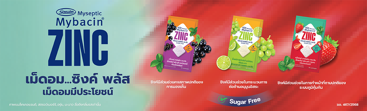 เม็ดอมซิงค์ รสทริปเปิ้ลมิ้นท์ ช่วยในการเจริญเติบโตของร่างกาย 20 ซอง ซองละ10 เม็ด Mybacin