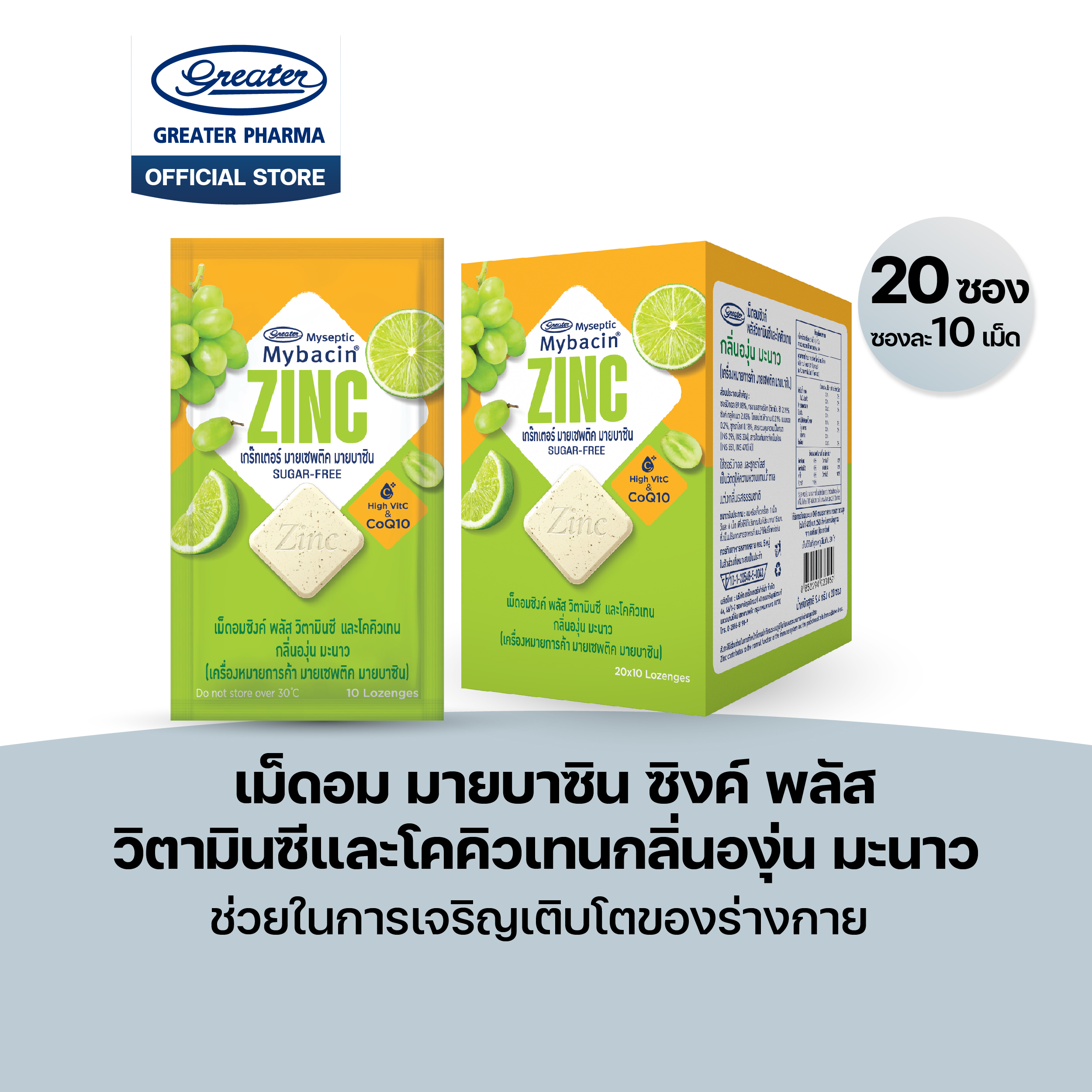 เม็ดอม ซิงค์ พลัส วิตามินซีและโคคิวเทน กลิ่นองุ่น มะนาว ช่วยในการเจริญเติบโตของร่างกาย 20ซองx10เม็ด Mybacin